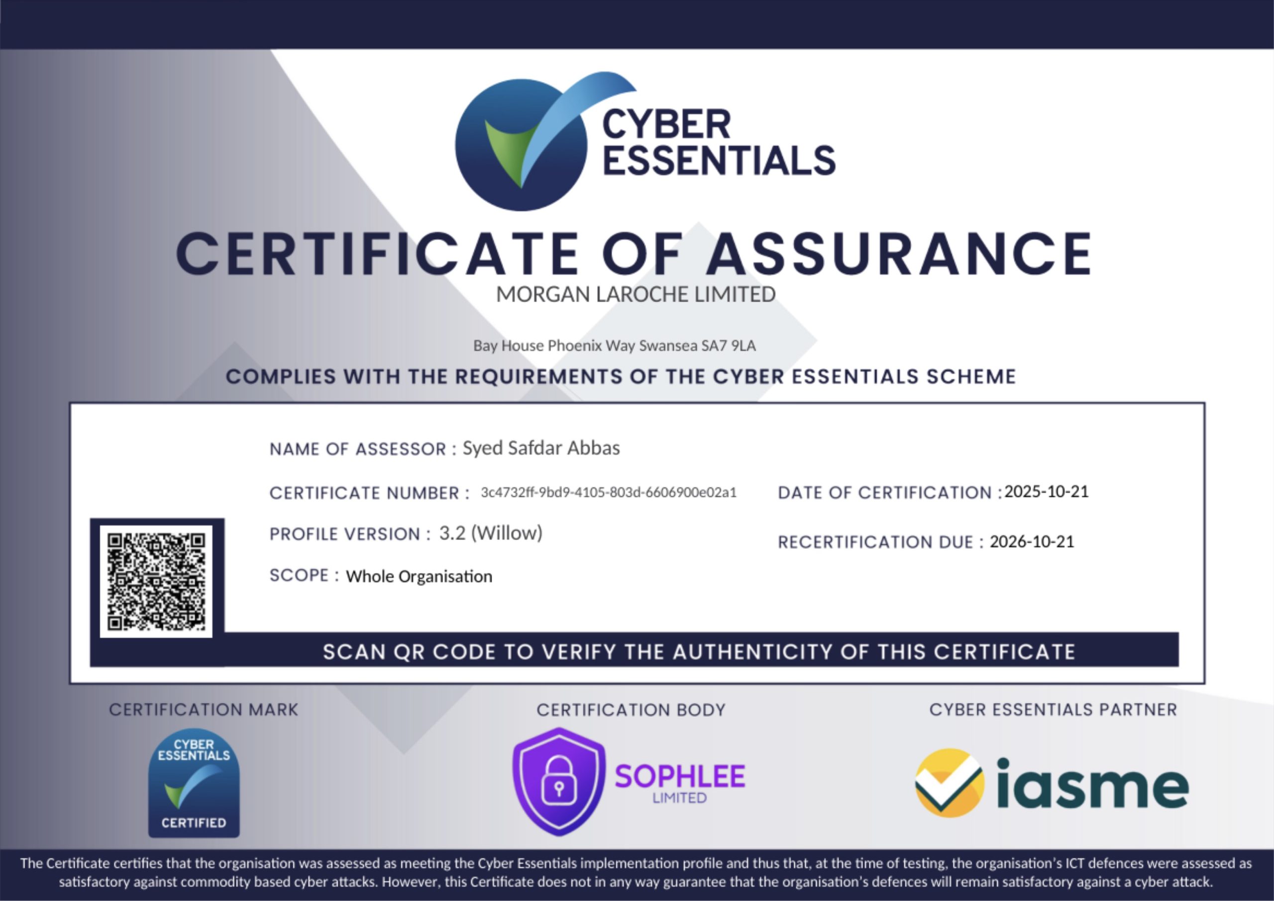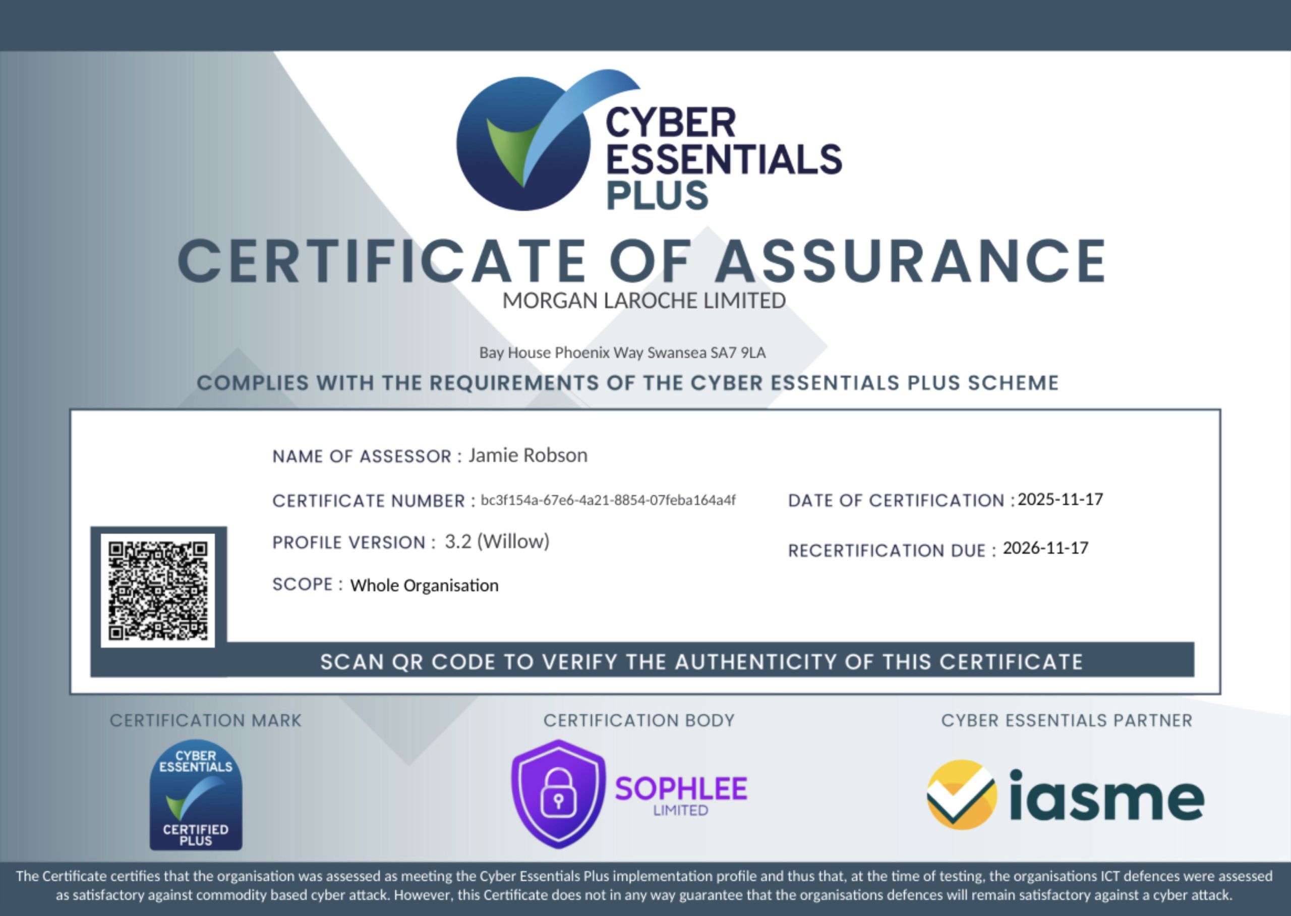 Cyber Essentials Morgan LaRoche Solicitors undertakes a cyber essentials audit annually. Please refer to our Cyber Essentials certificates: Cyber Essentials Certificate of Assurance 2025 Cyber Essentials Plus Certificate 2025
